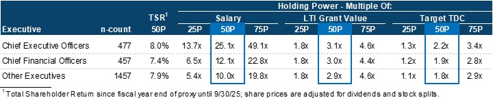 We sourced executive-by-executive equity holdings data for the members of the S&P 500 (as of 7/15/25) using each company’s proxy-disclosed Outstanding Equity Awards table. All equity is valued as of 9/30/25 so that each company is broadly affected by the same market realities, with individual compensation levels as of the same fiscal year end. Holding Power multiples were individually arrayed and categorized based on salary, LTI grant value, and target TDC for CEOs, CFOs, and other Named Executive Officers (i.e., “top-five” executives excluding non-CEO Executive Chairs).
